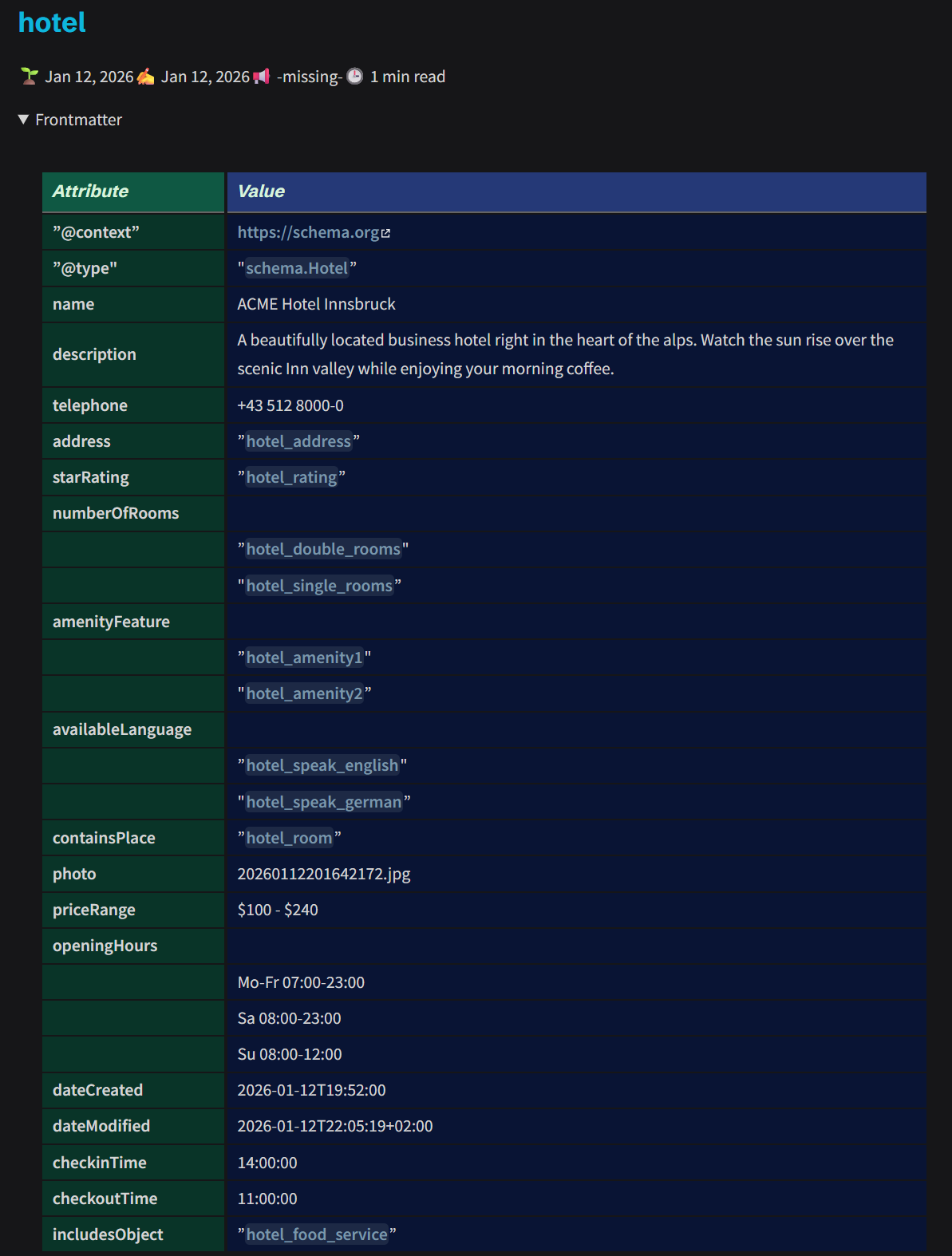 YAML-LD helps bridge this gap. When Schema.org is expressed in YAML-LD, particularly within a tool like Obsidian, it shifts from being only a markup layer into a human-centered knowledge base. YAML is easy to read and edit, works naturally with version control, and supports ongoing refactoring as models change. Within Obsidian, YAML can be combined with Wikilinks to interlink types, properties, and enumerations, allowing authors to navigate the vocabulary as a connected knowledge graph rather than as isolated files. This makes relationships easier to understand, encourages exploration, and surfaces dependencies naturally. From this single, interlinked source, the schema can then be reliably transformed into multiple machine-readable formats such as JSON-LD or RDF for publication and deployment.